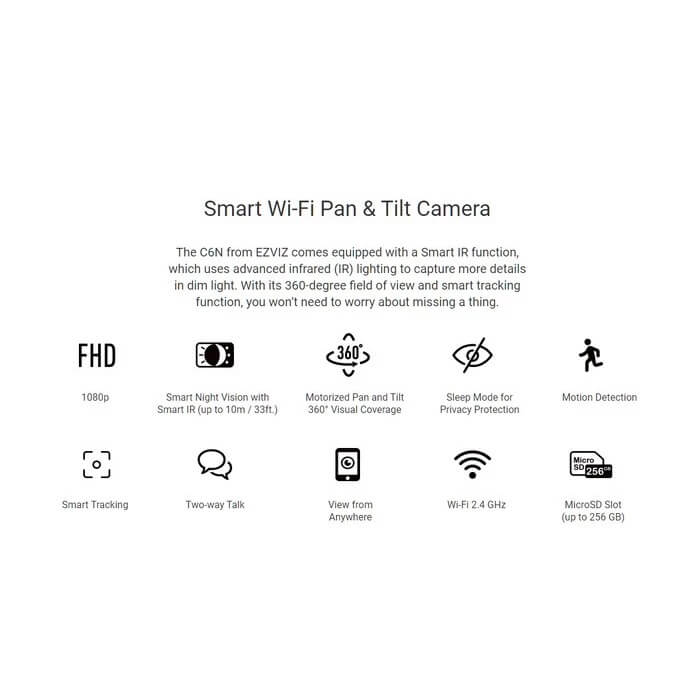 Packaging Contents : C6N camera; Base; Screw Kit; Power Cable 3m (9.8 ft.); Drill Template; Power Adapter; Quick Start Guide